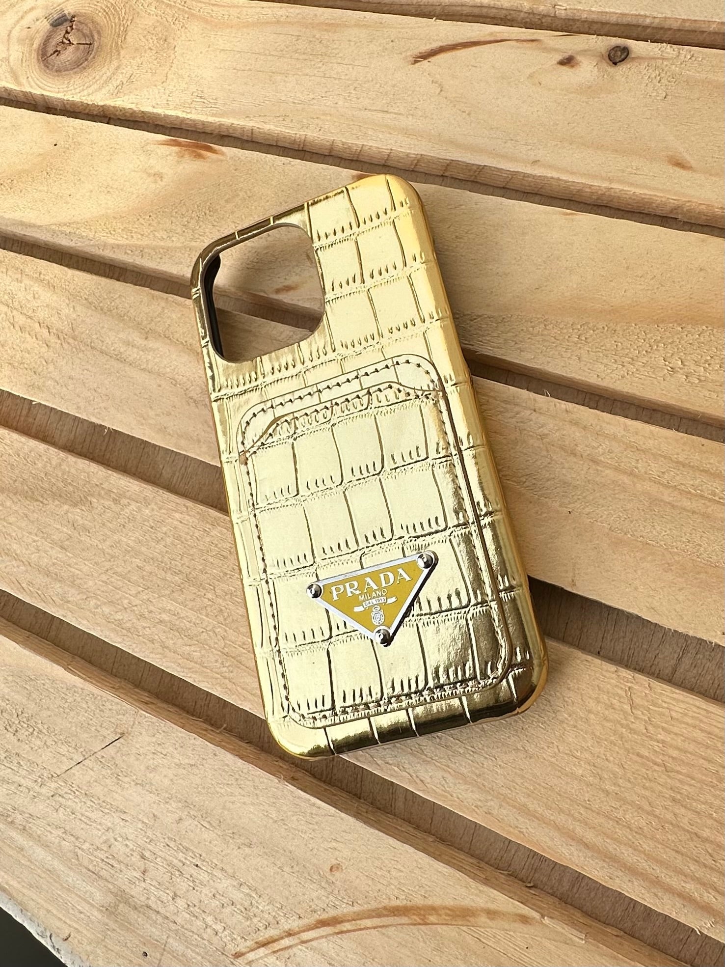 Soft fiber case leather embossed with prada metal logo on top soft material for protection.